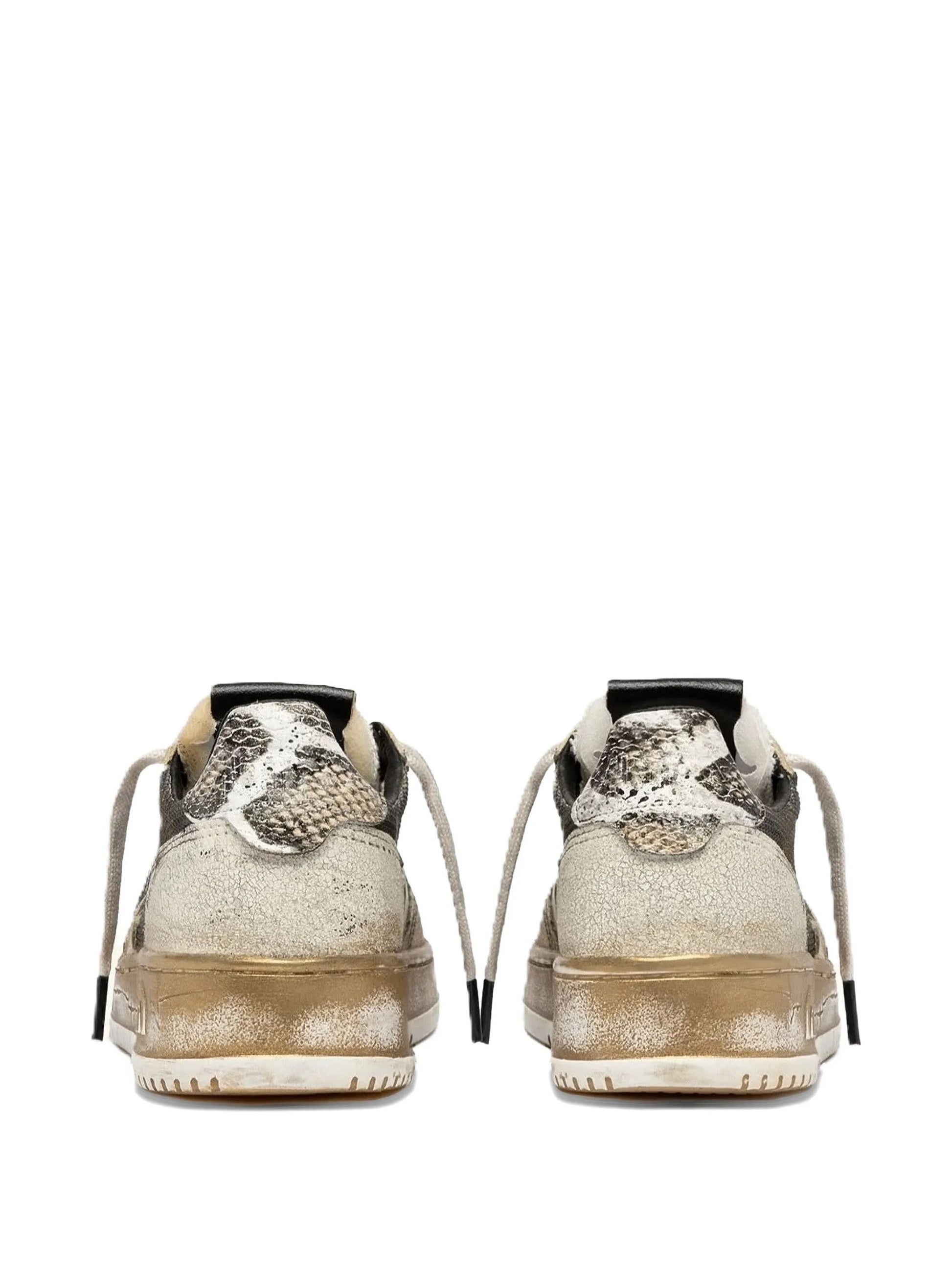 La sneakers Medalist Super Vintage è l'espressione più autentica di Autry. Il design d'ispirazione tennis è comodo e accogliente grazie ai materiali di alta qualità, mentre il richiamo agli anni '80 è esaltato dai trattamenti artigianali che creano un aspetto used irregolare e unico per ogni modello. Questa scarpa da ginnastica è realizzata in pelle liscia e pelle craquelé bianca dal look vissuto e inserti in mesh marrone. L'inserto laterale cattura l'attenzione sul caratteristico logo Autry. Da notare le sfumature dorate sia sulla tomaia che sulla suola e il talloncino logato con effetto pelle pitonata. Il trattamento esclusivo utilizzato per creare l'aspetto vintage è interamente Made in Italy.