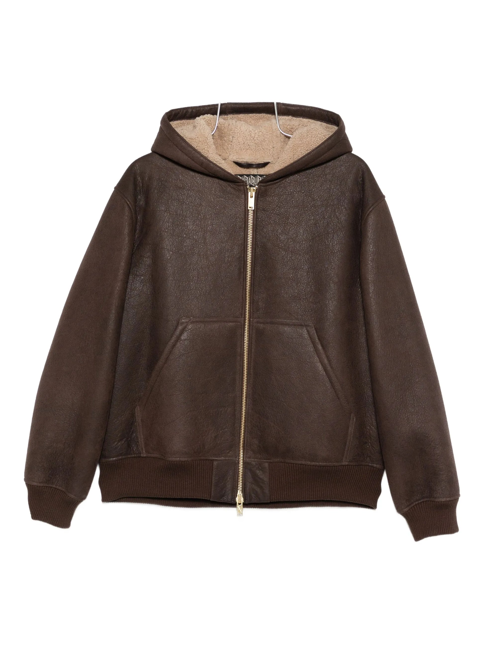 Modello con cappuccio in morbido shearling Maniche a giro in stile camicia Chiusura a zip con doppio cursore logato Polsini e orlo a coste sottili per una vestibilità impeccabile Tasche frontali oblique Completamente foderato in shearling naturale