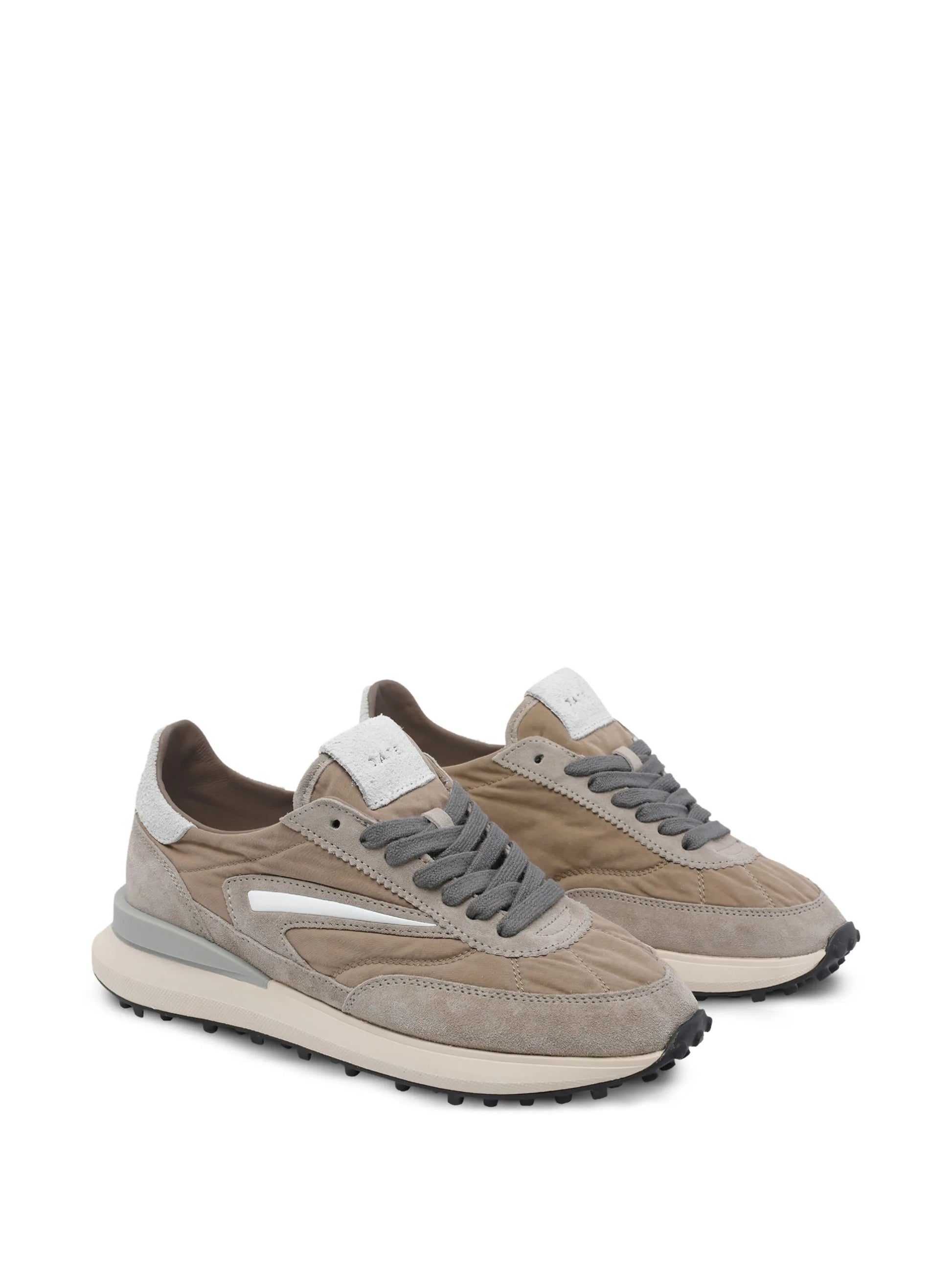 Sneakers in nylon e suede colore taupe, con lacci in cotone, logo quadrato è ricamato sul talloncino in suede hairy colore bianco, dettaglio laterale impresso colore bianco, fodera in pelle e spugna di cotone.