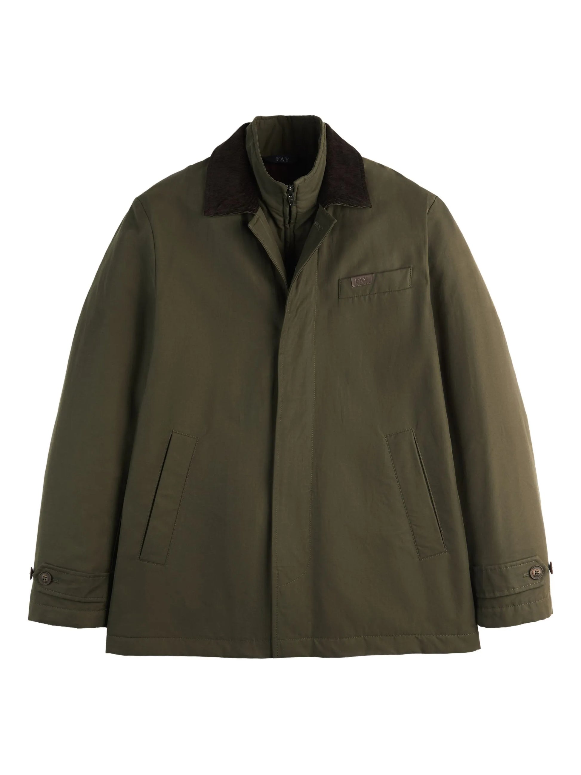 Morning double front in versione raincoat corto, realizzato in faille di cotone e nylon con trattamento antigoccia. Arricchito da un collo in velluto e alamari sul fondo manica, ha un'imbottitura in ovatta e una calda fodera a trama check. Questo modello d'ispirazione british presenta tasche a filo laterali, una arricchita dall'etichetta in pelle con logo Fay e un taschino pochette. Completano il capo una chiusura con zip, bottoni nascosti e una pratica tasca interna.