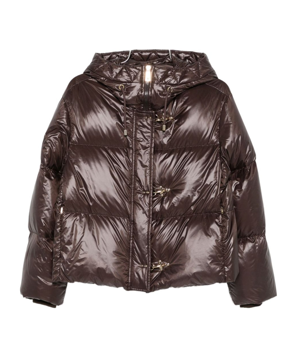 Piumino dal gusto sportivo arricchito da tre iconici ganci Fay. Realizzato in nylon lucido a righe con proprietà down proof e water repellent, è caratterizzato da un cappuccio avvolgente e polsini antivento. Completano il modello una chiusura con zip e tasche verticali a filetto con cerniera.