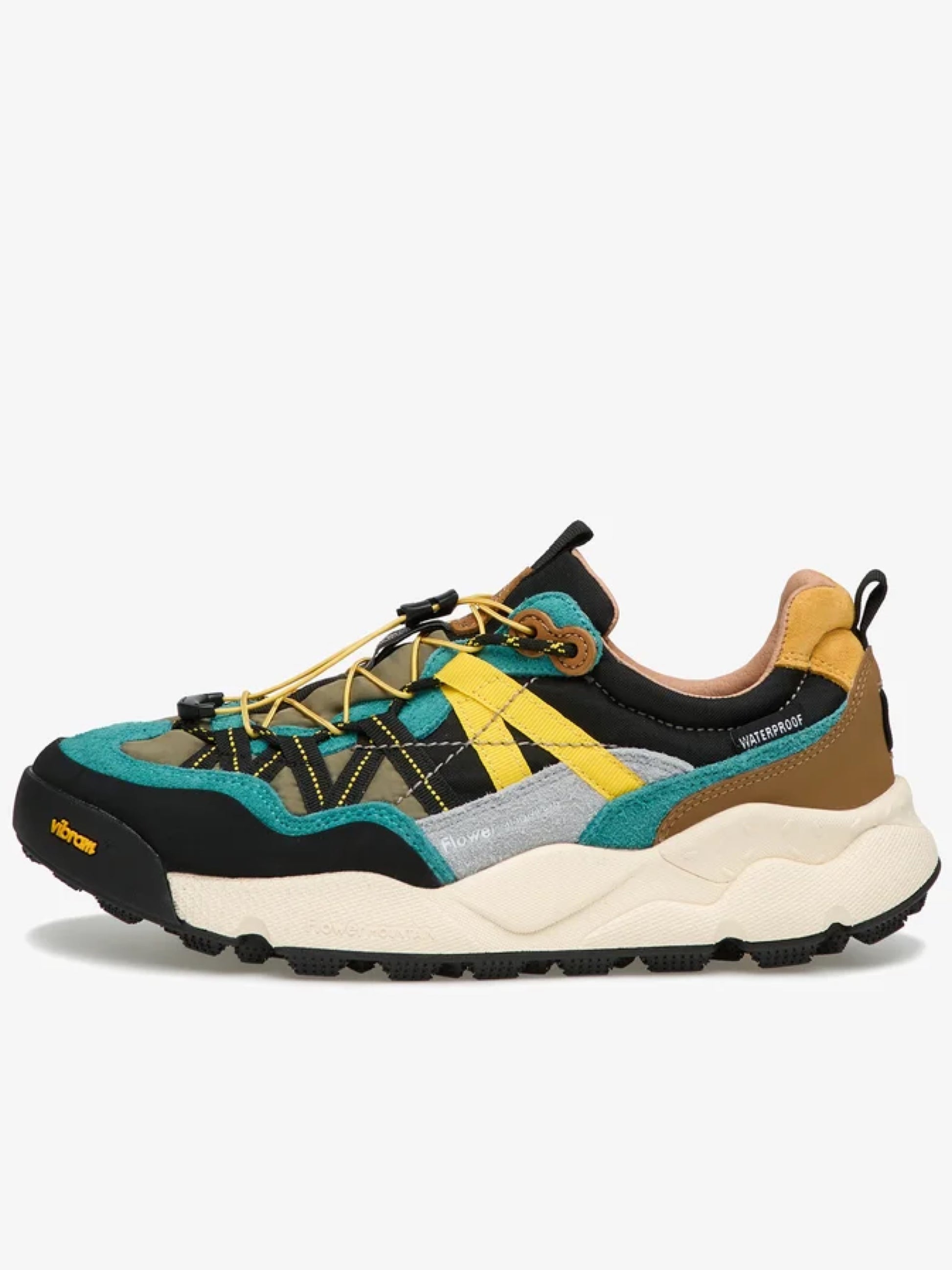 Hiking shoe in tessuto tecnico e suede con membrana interna waterproof. Chiusura con stringhe trekking e regolatore quick stop, fodera in pelle e soletta in sughero naturale antibatterico. Fondo Vibram personalizzato.