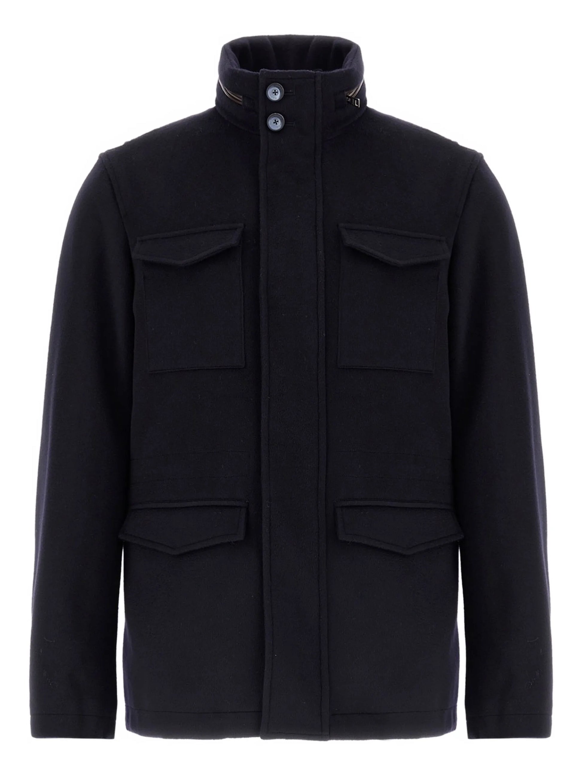 Field Jacket in tessuto di lana e cashmere garzato dalla mano morbida e dall'aspetto opaco. Presenta fodera in microfibra di nylon riciclato con un leggero coating sul rovescio che rende la texture impermeabile, morbida al tatto e dall'aspetto opaco. Il modello reinterpreta un'icona dell'abbigliamento casual in chiave ricercata e aggiunge il dettaglio funzionale del cappuccio di servizio, utile in caso di piogge improvvise. La coulisse interna al punto vita permette di regolare la vestibilità.
