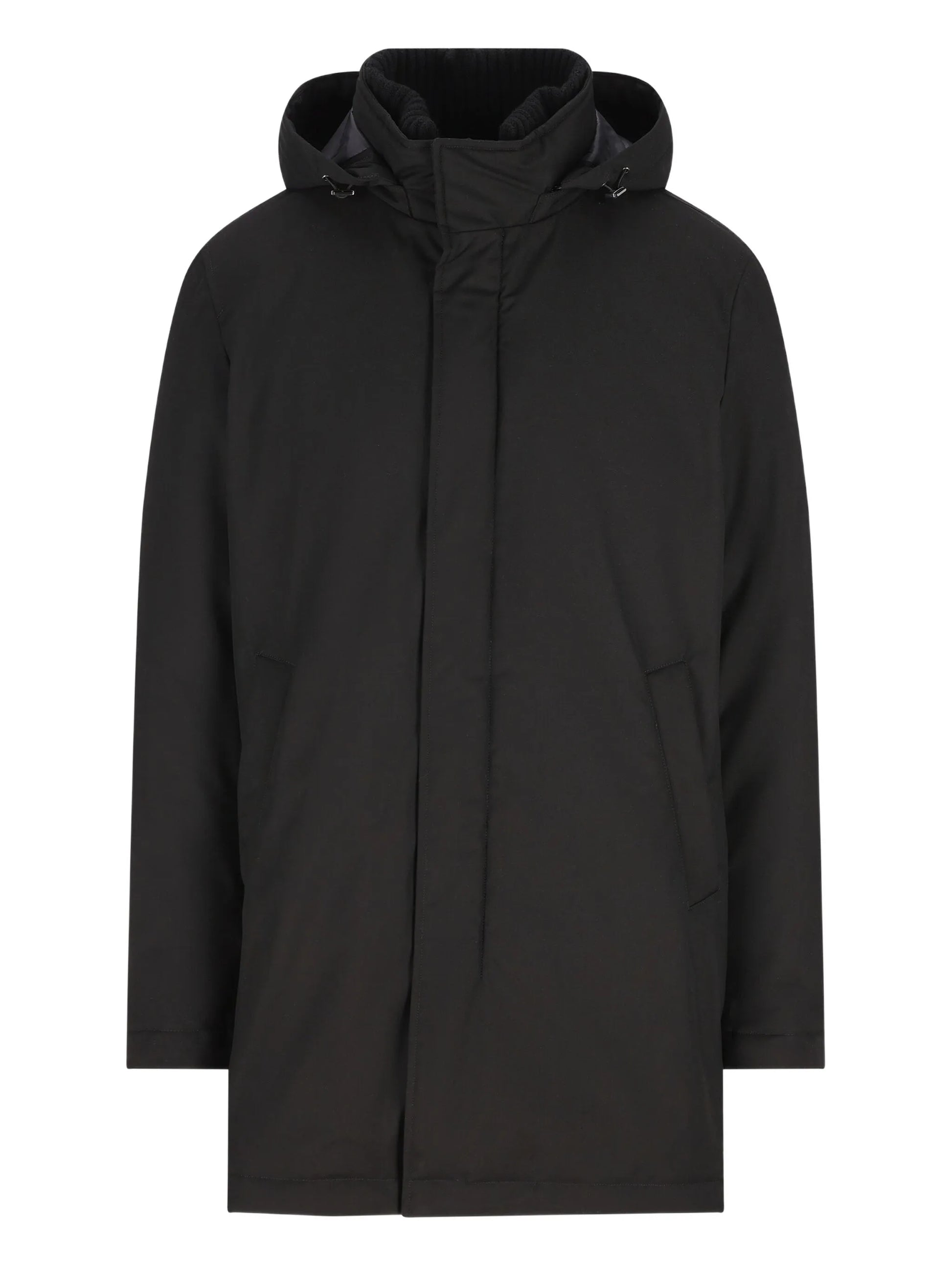 Giaccone in tessuto tecnico trattato per ricreare l'aspetto pregiato di un pettinato laniero e rifinito con una membrana super light traspirante e antivento. Una silhouette essenziale ma sofisticata, concepita nel segno della funzionalità con coulisse al cappuccio e zip a doppio cursore per regolare la vestibilità. Si caratterizza per la fodera nell'iconico Nylon Ultralight, l'espressione più autentica dello stile Herno. Una tecnologia esclusiva che prevede la scelta di Nylon giapponese 20 denari e una piuma pregiata 90/10 inserita a iniezione per offrire una sensazione ancora più leggera. Il risultato è una buona resistenza all’acqua con un effetto tattile particolarmente lussuoso simile alla seta.