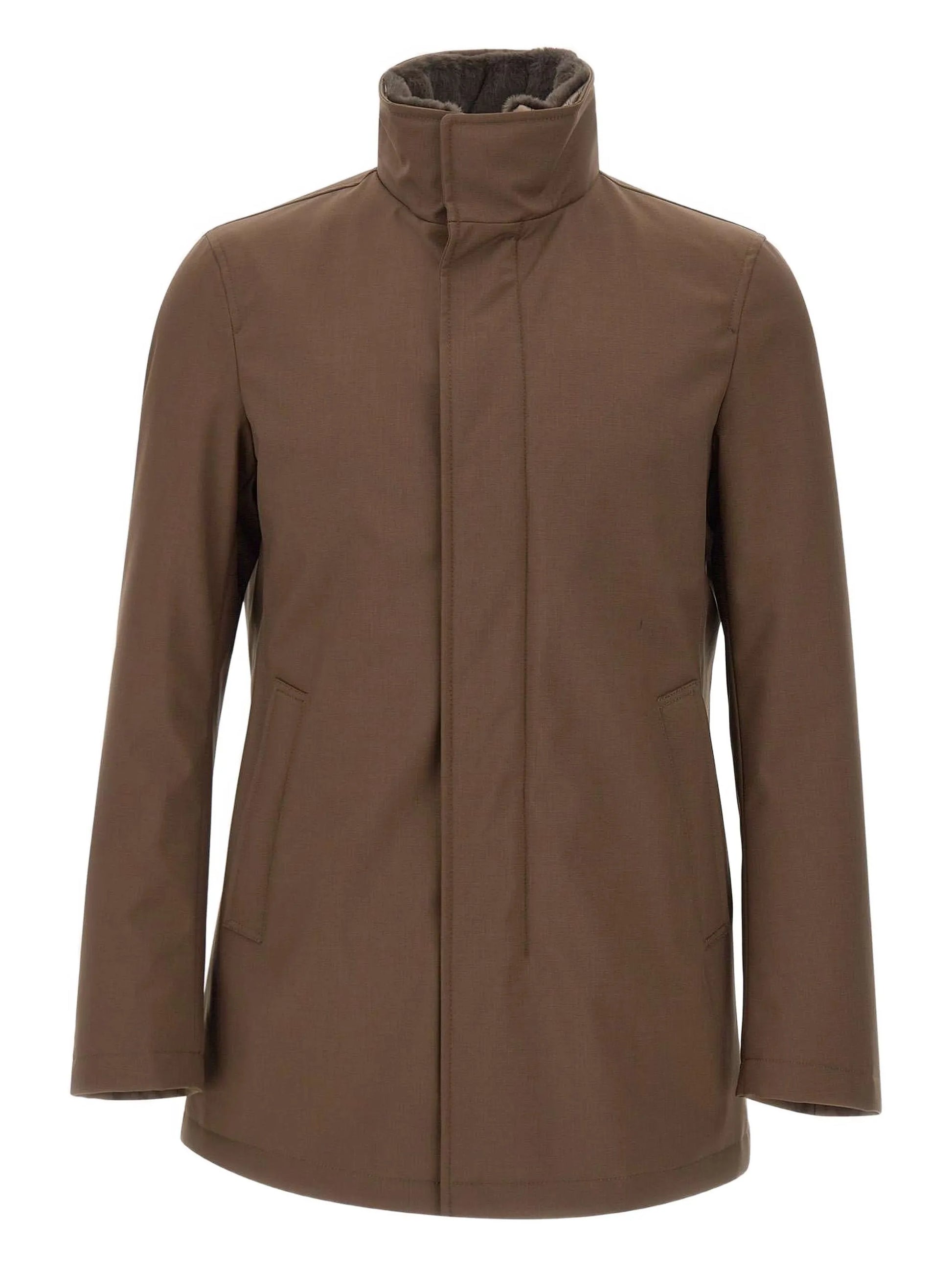 Carcoat in twill di poliestere dall’aspetto laniero mélange. Il tessuto è rifinito con una membrana che offre resistenza all'acqua e al vento. Il modello combina vestibilità contemporanea e costruzione funzionale per completare con una ricercata nota Herno il guardaroba quotidiano. Il collo alto è rifinito in faux fur effetto castorino che unisce un aspetto ricco con una mano confortevole e morbida.