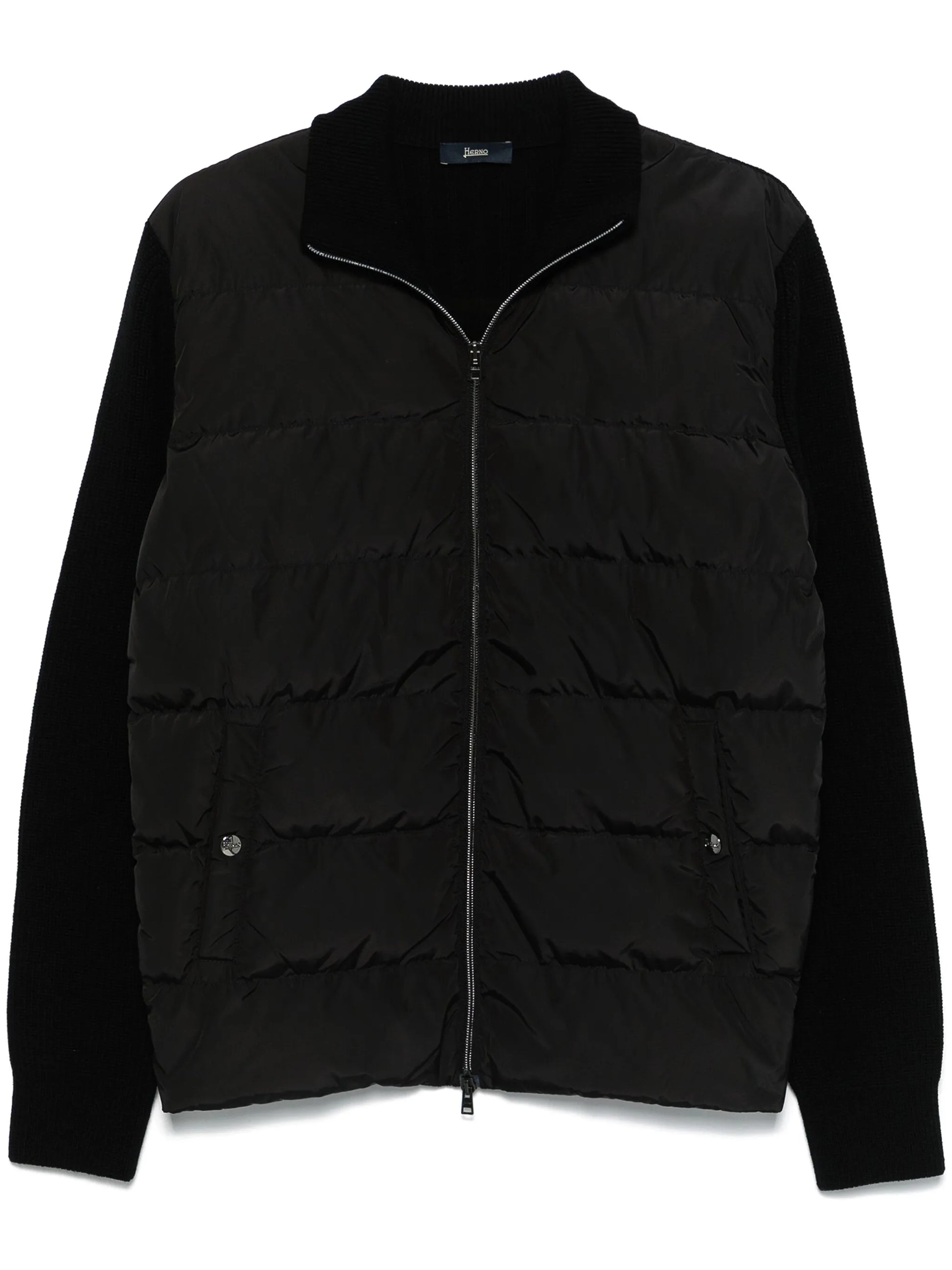 Cardigan realizzato in pura lana pettinata con lavorazione punto pannocchia. Il fronte imbottito e rifinito in nylon water repellent rende il capo pratico da indossare anche come outerwear leggero durante la stagione intermedia.