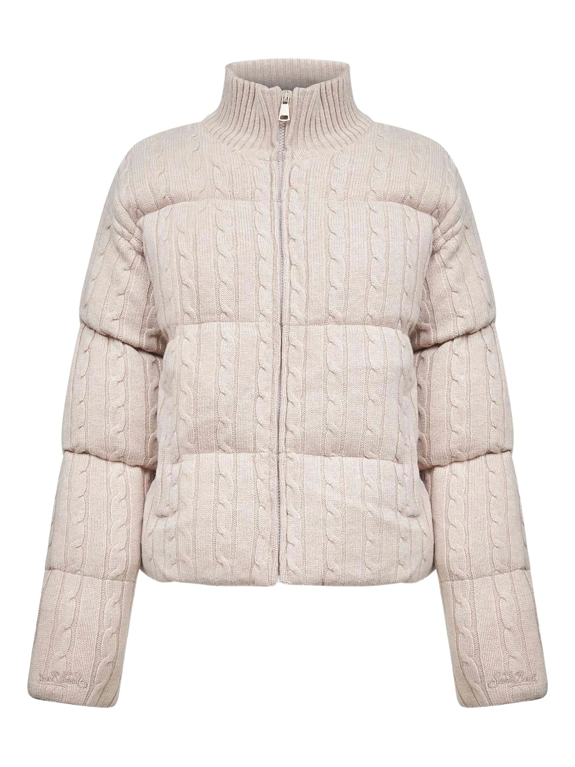 Giacca in maglia imbottita, collo alto in maglia a coste, chiusura con zip, due tasche con filetto singolo, polsi elasticizzati con morbido arriccio fondo elasticizzato con coulisse interna.