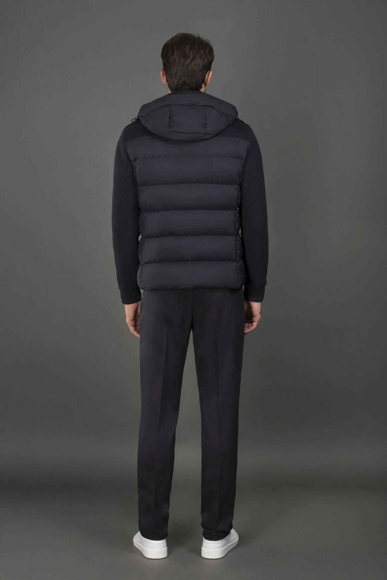 Giacca imbottita in piuma e composta da un mix di materiali. Corpo e cappuccio sono realizzati in tessuto opaco down-proof 2 denari, simile alla seta, con sottili stropicciature in superficie. Dettagli realizzati in flanella australiana extra fine garzata, morbida e confortevole. Completa il capo la manica realizzata in lana mista a cashmere, lavorata con punto pannocchia.