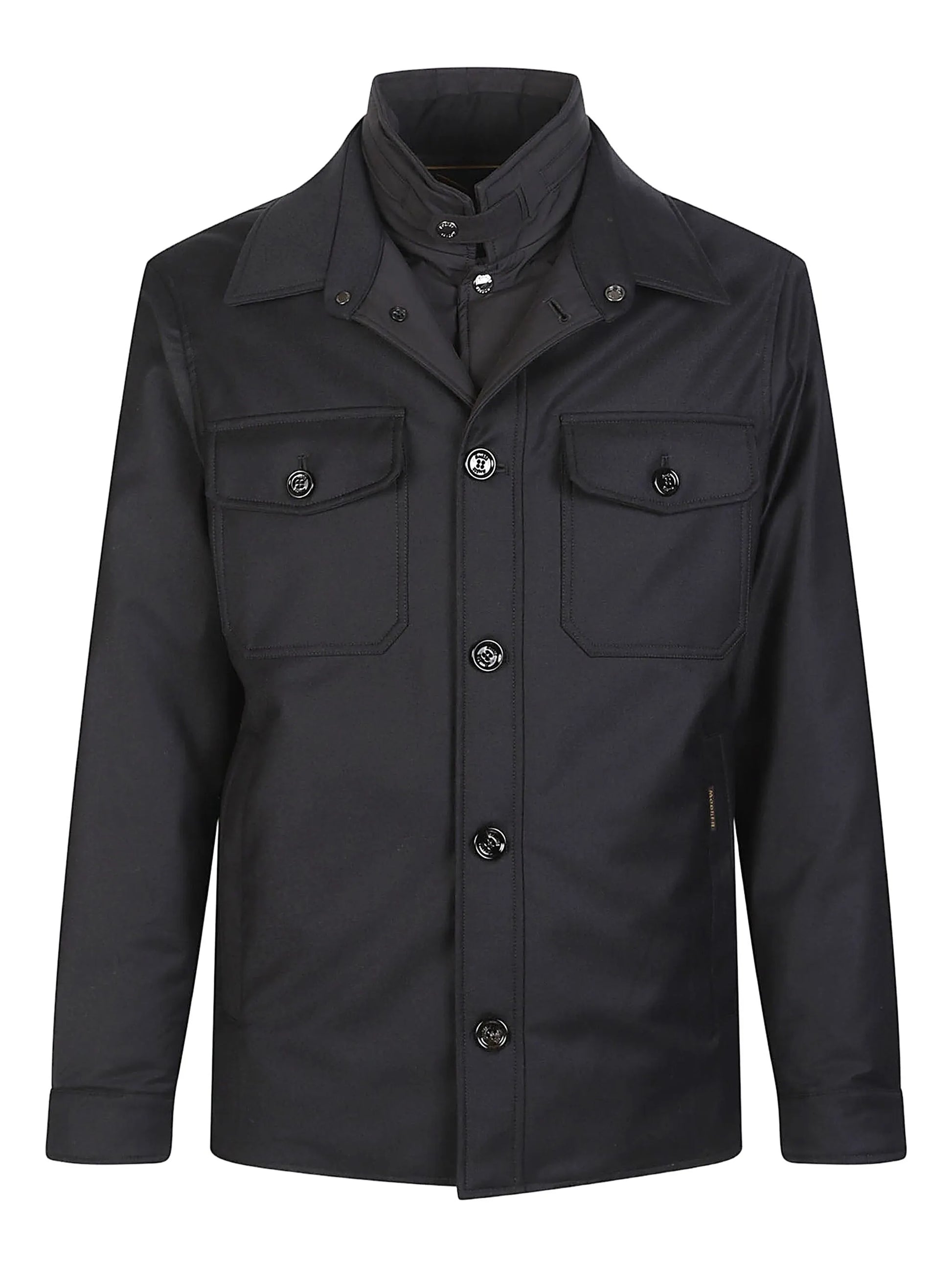 Overshirt appartenente alla linea Acqua (2 ombrellini). Realizzata in flanella di lana vergine mista a cashmere accoppiata a membrana traspirante e waterproof, leggera e confortevole. Lana vergine Stacchino interno removibile con cappuccio Vestibilità regolare Chiusura frontale con bottoni in corno a vista Tasche a toppa con pattina e bottoni in corno sul petto Tasche laterali a filetto con bottone a pressione a vista Collo e polsi tipici di una camicia
