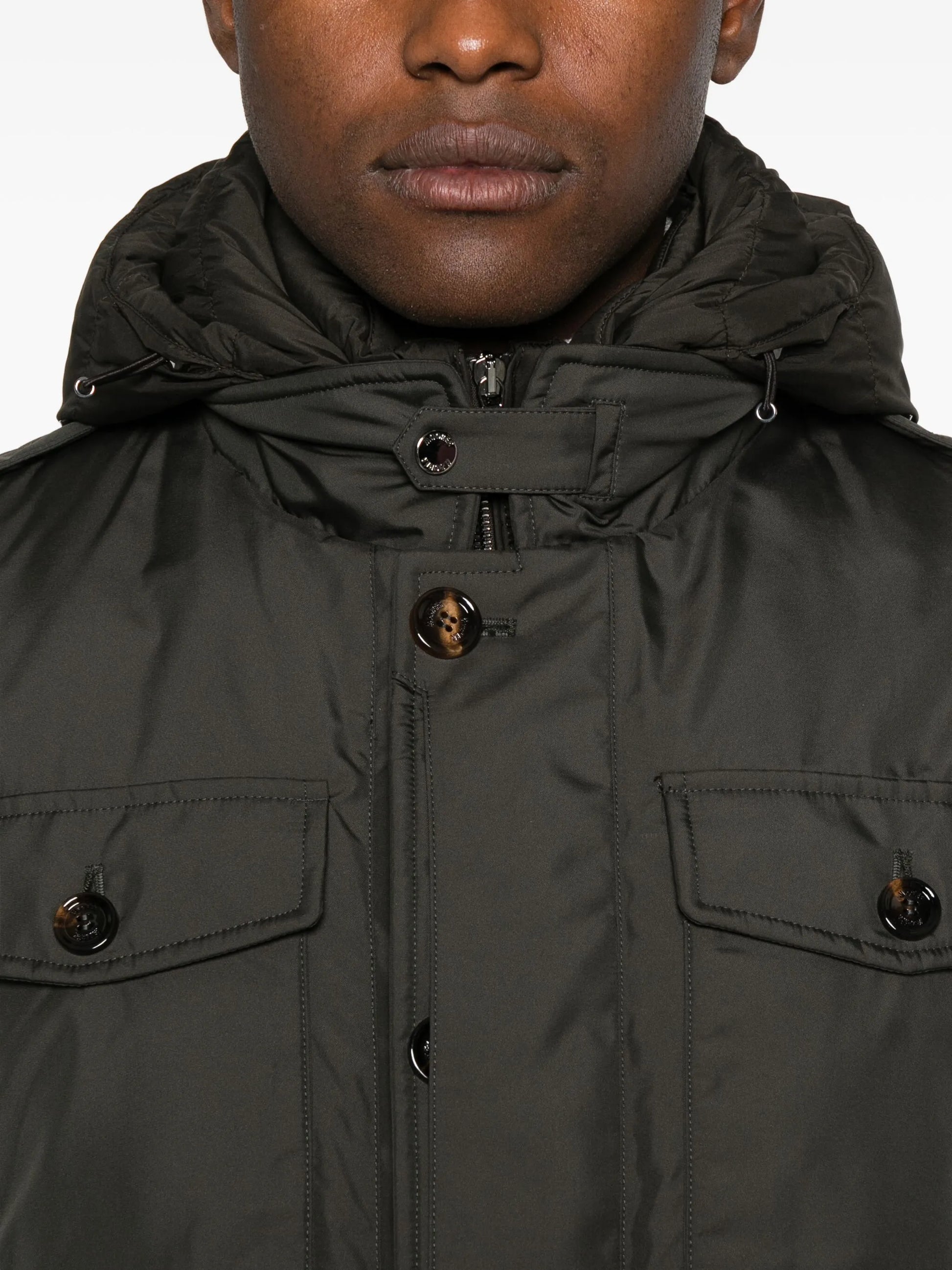 Sahariana liscia appartenente alla linea Acqua (1 ombrellino), imbottita in piuma d'oca. Realizzata in tessuto tecnico shape memory con una leggera resinatura, che dona al capo una modesta resistenza all’acqua. Il particolare trattamento conferisce al tessuto una leggera lucentezza, accentuata soprattutto nelle tonalità più scure. Stacchino removibile con cappuccio regolabile, imbottito, trapuntato a boudin e chiuso da zip Collo in piedi con cinturino e bottone a pressione Doppia chiusura frontale con zip in metallo e bottoni in corno nascosti da finta Bottone a pressione sul fondo della chiusura