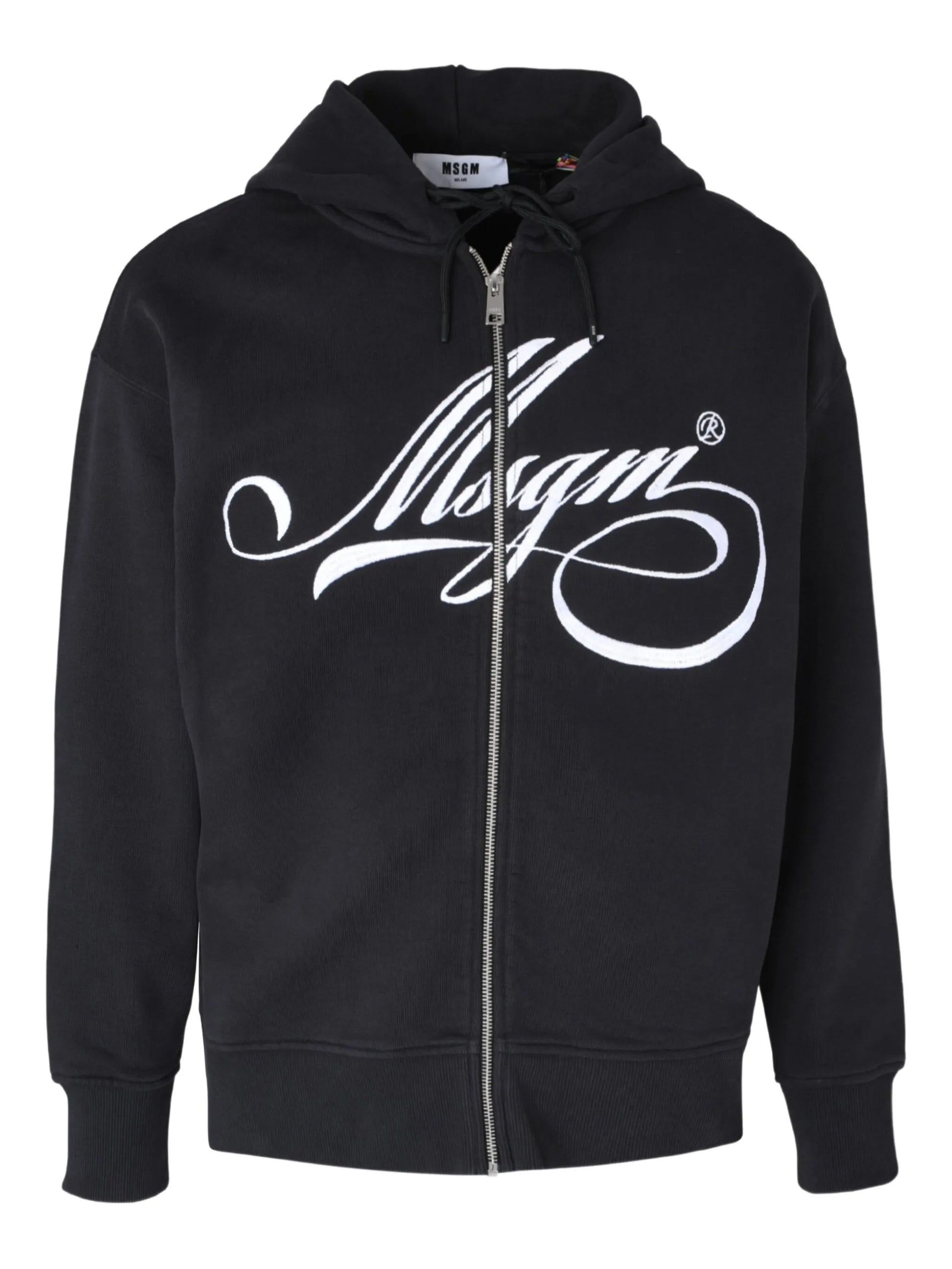 Felpa in jersey di cotone con logo MSGM corsivo ricamato in contrasto sul fronte. Cappuccio con coulisse, fondo e polsini a costine. Apertura con zip anteriore. Spalle scese e maniche lunghe.