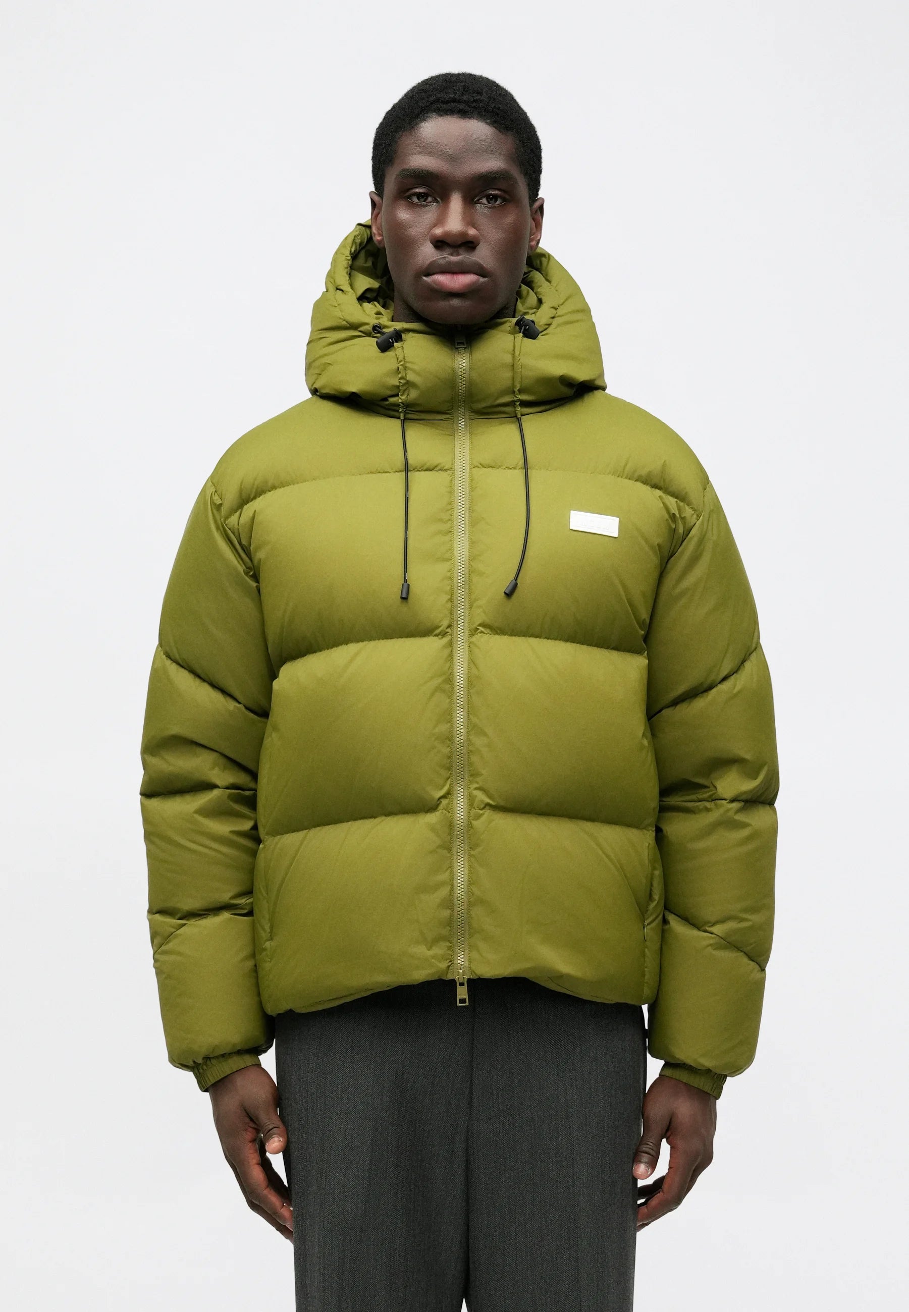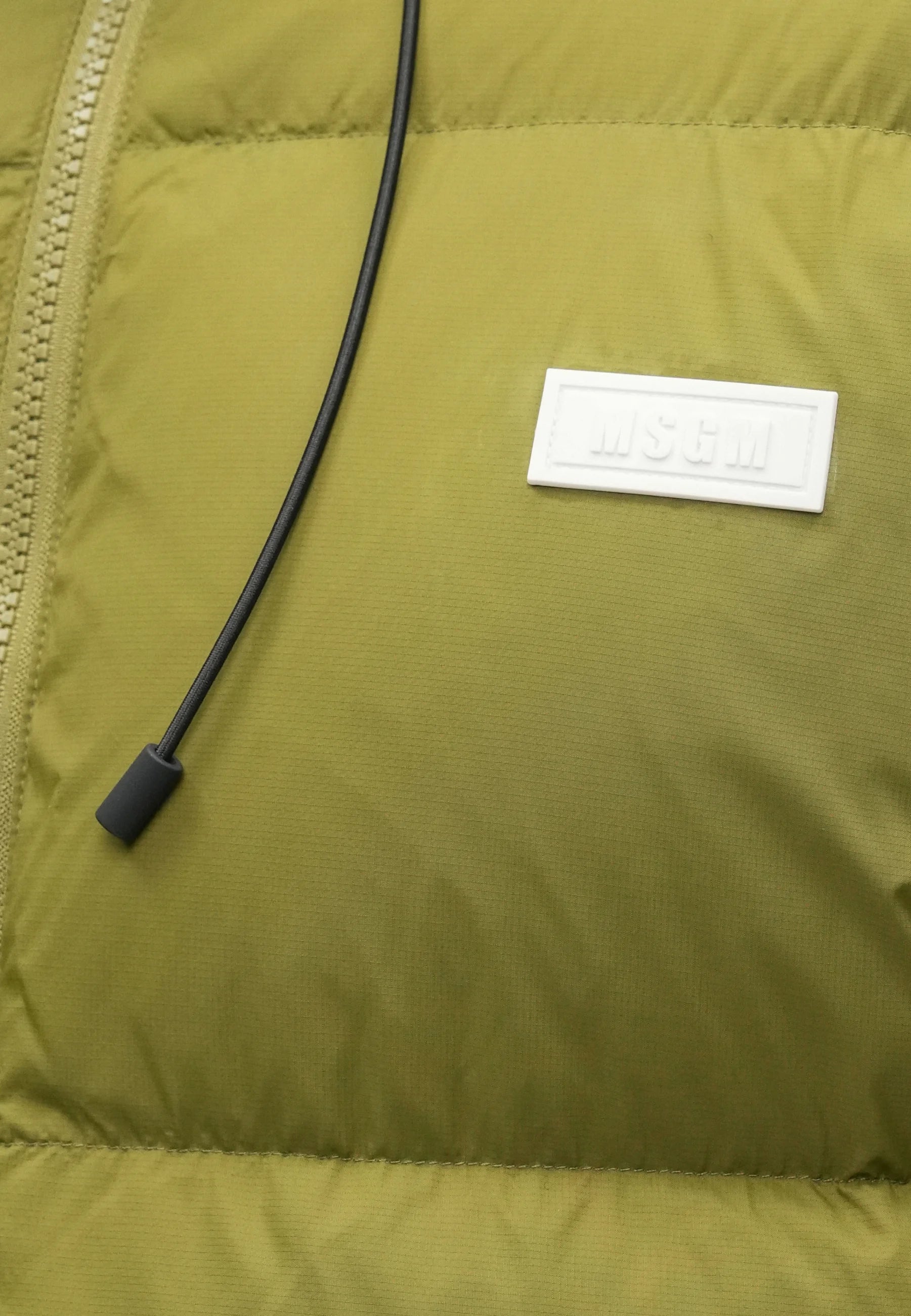 Piumino in nylon ripstop tinta unita. Cappuccio integrato, maniche lunghe con polsini elastici e trapuntatura orizzontale all-over. Tasche anteriori e laterali con zip a doppio cursore. Orlo regolabile con coulisse. Patch con logo sul petto.