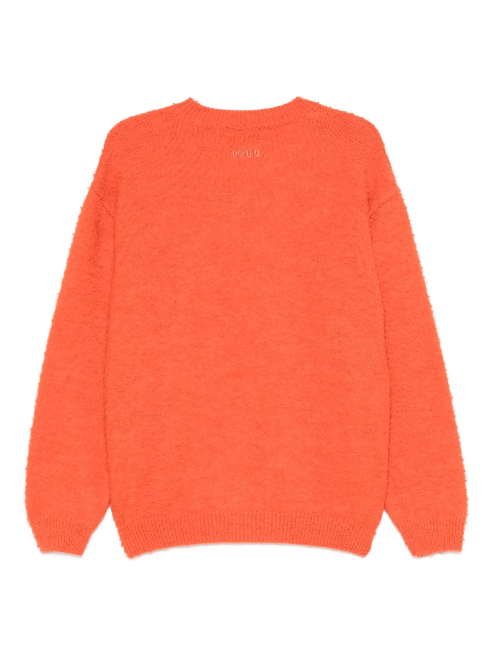 Maglione girocollo infeltrito, effetto casentino, lavorazione a costine su collo, polsini e fondo.