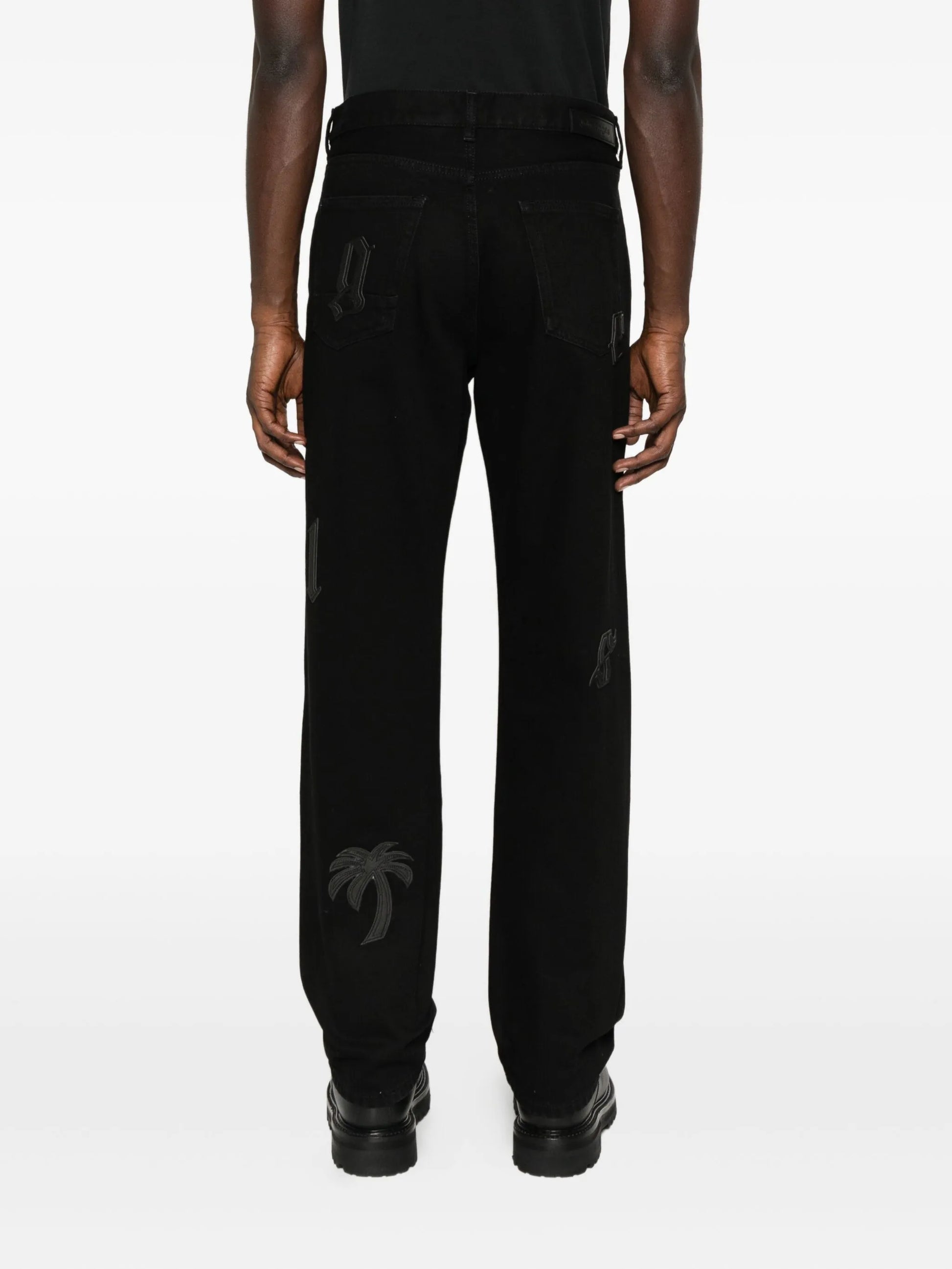Realizzati in denim di alta qualità, questi jeans a gamba dritta presentano vistose toppe con logo per un tocco streetwear distintivo.