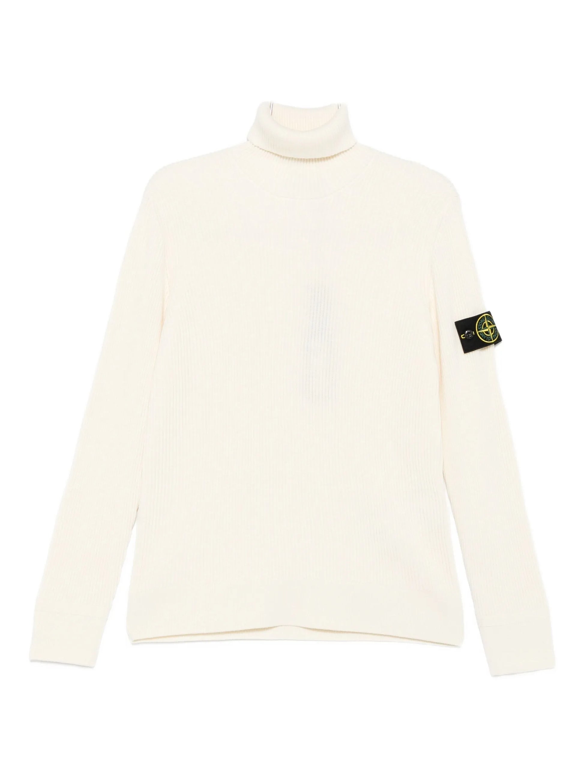 Maglione dolcevita in lana RWS interamente lavorata a costine, colletto a costine, polsini finemente lavorati con impuntura orizzontale, fascia sul fondo rifinita a costine. Finezza 12.